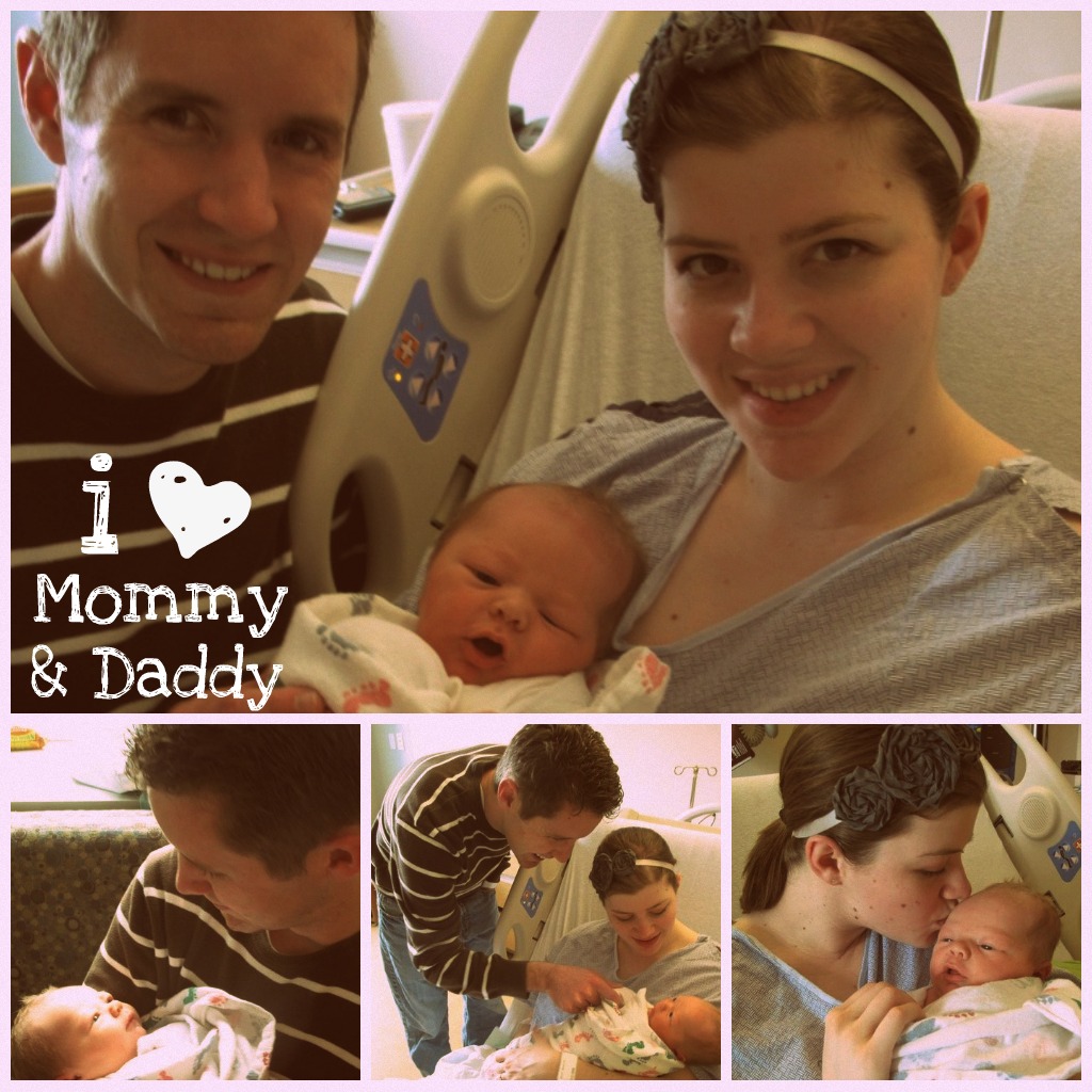 After maybe an hour of pushing our lovely little boy was born at 2:36am without any complications for either of us, other than having us both having a fever. Justin even cut the cord! He was much bigger then I had anticipated, at 8 pounds 7 ounces, the doctor even asked where I had been hiding all of him. When he was born he had quite the cone head which is hidden by the hat in the next picture.